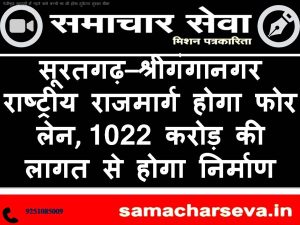सूरतगढ़–श्रीगंगानगर राष्ट्रीय राजमार्ग होगा फोर लेन, 1022 करोड़ की लागत से होगा निर्माण